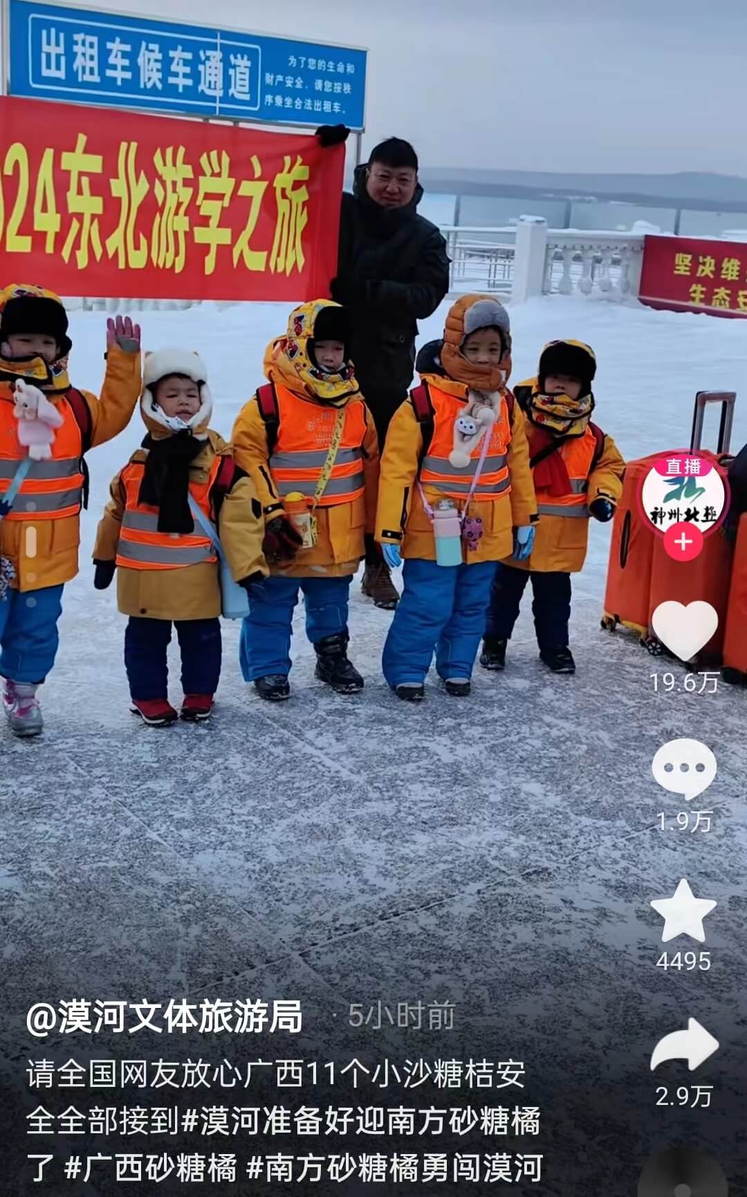漠河文体旅游局称:广西11个小砂糖橘安安全全全部接到。漠河消防直播准备迎接将要来游学的“小砂糖橘”,还在外面堆了用砂糖橘装饰的雪人。